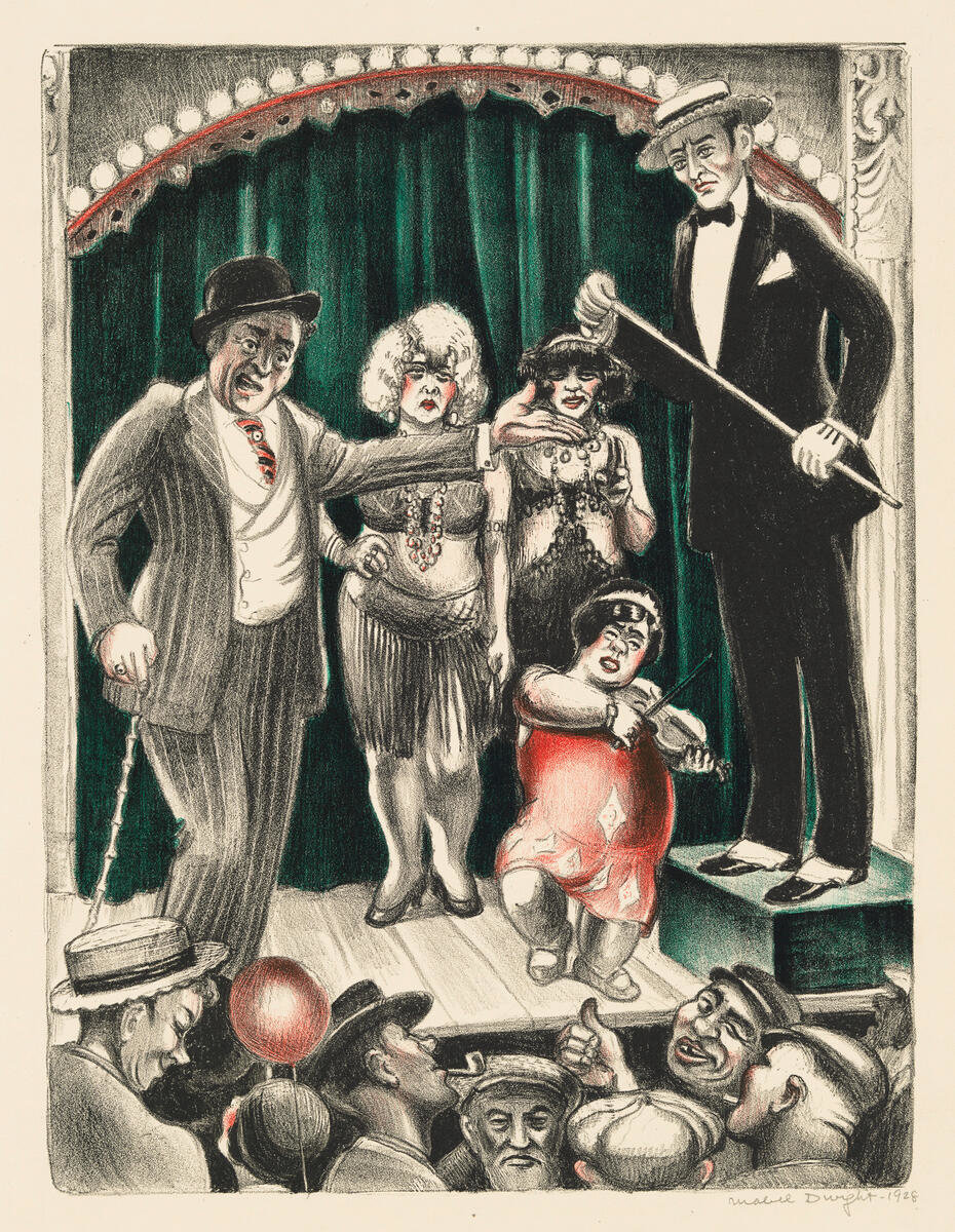 Mabel Dwight (1876–1955) wrote that keeping “a cool head and a warm heart” was essential to making art that would be a “living influence on the world.” Dwight came to New York at the turn of the century as an illustrator and later fell in with the downtown artists who frequented the Whitney Studio Club, a precursor to the Museum. She ultimately found her voice in the swooping lines and seamless gradients of lithography. This democratic print medium became her primary vehicle for portraying her constant subject: the people and places of New York.